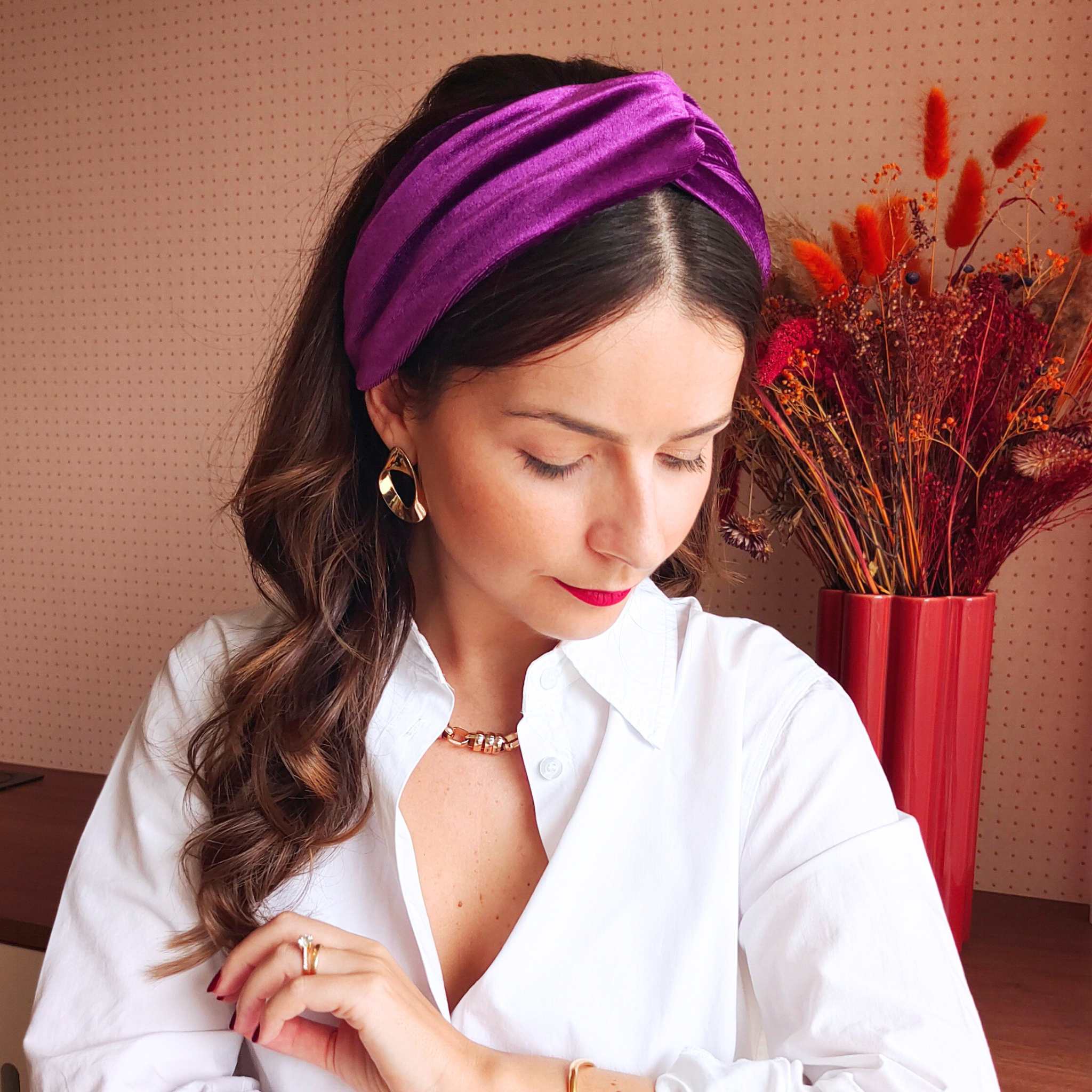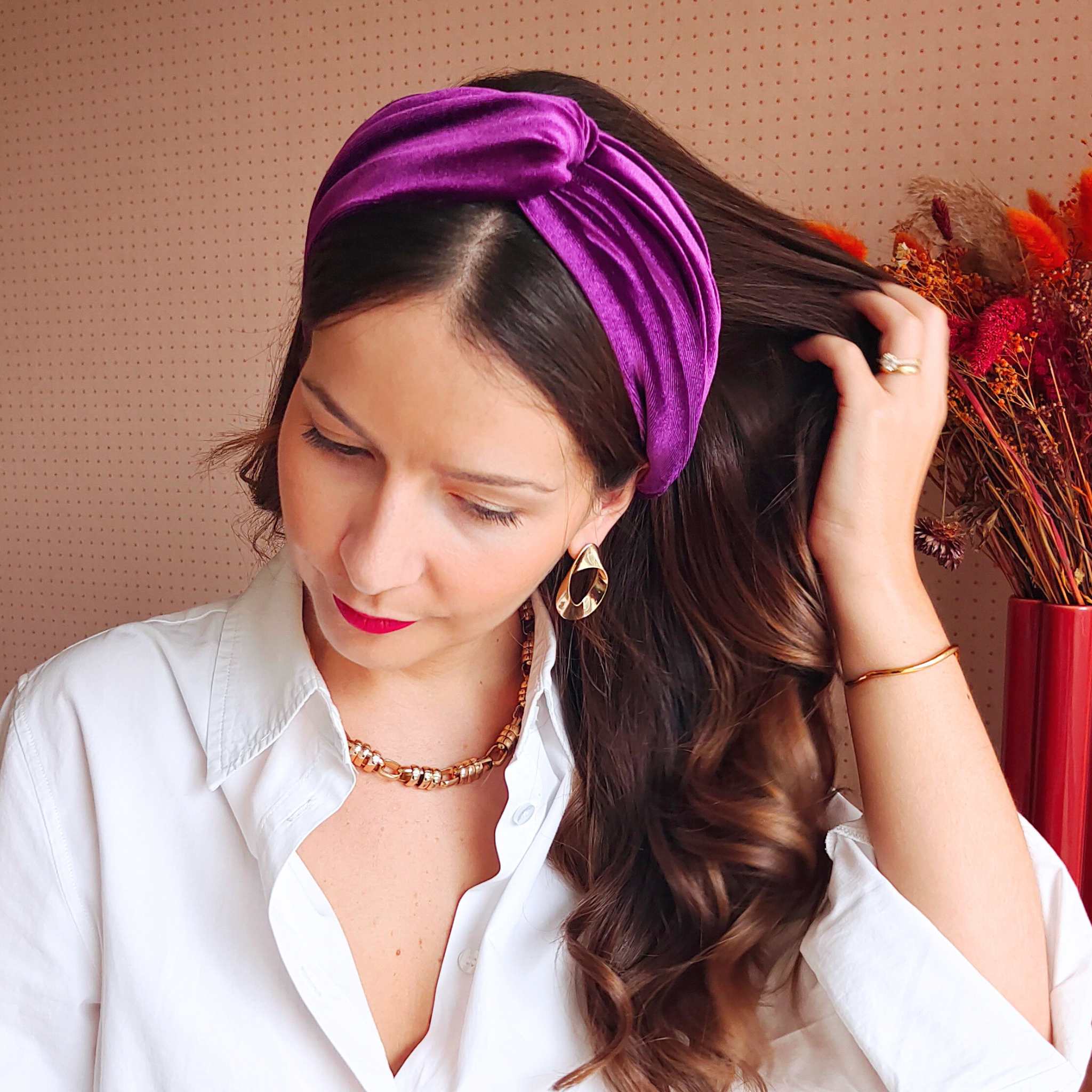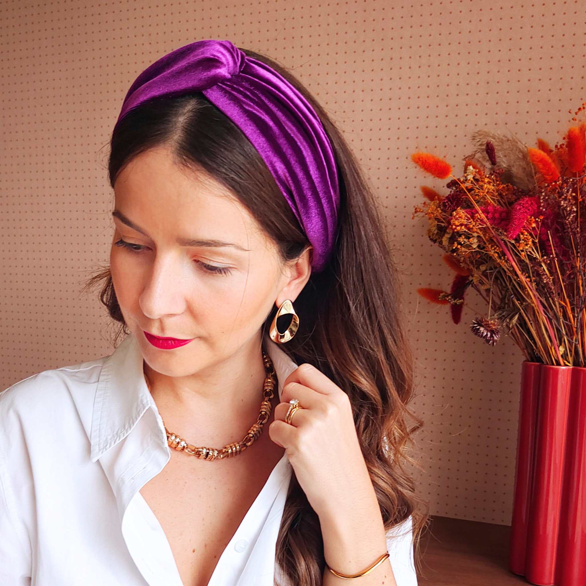 Découvrez ce headband en velours violet et son magnifique drapé aux accents disco.