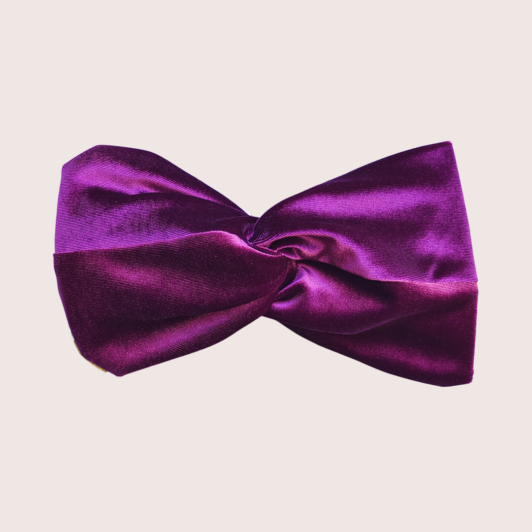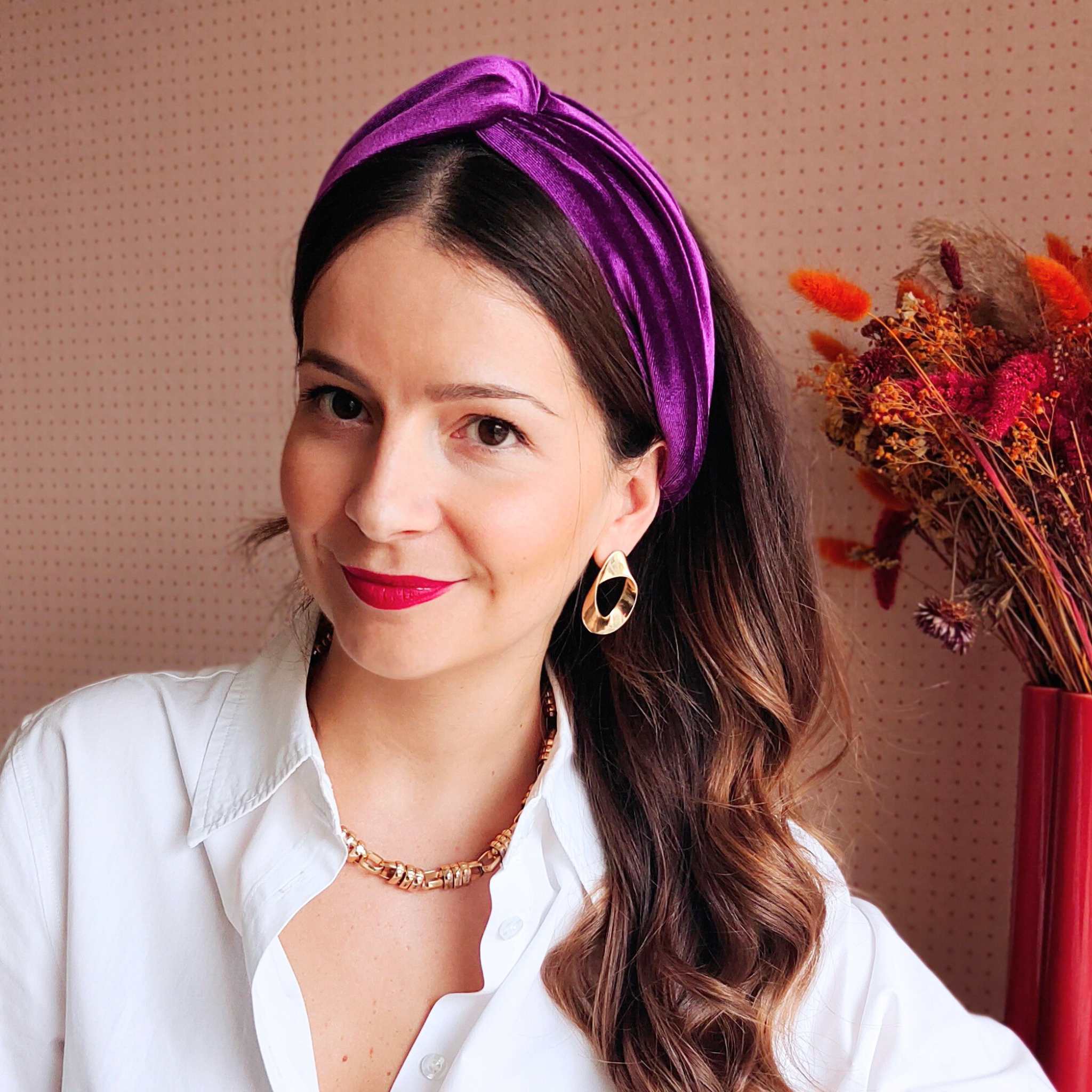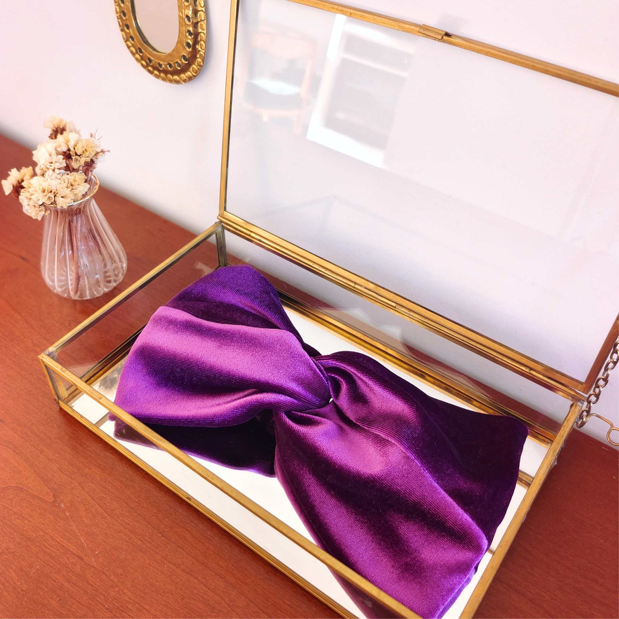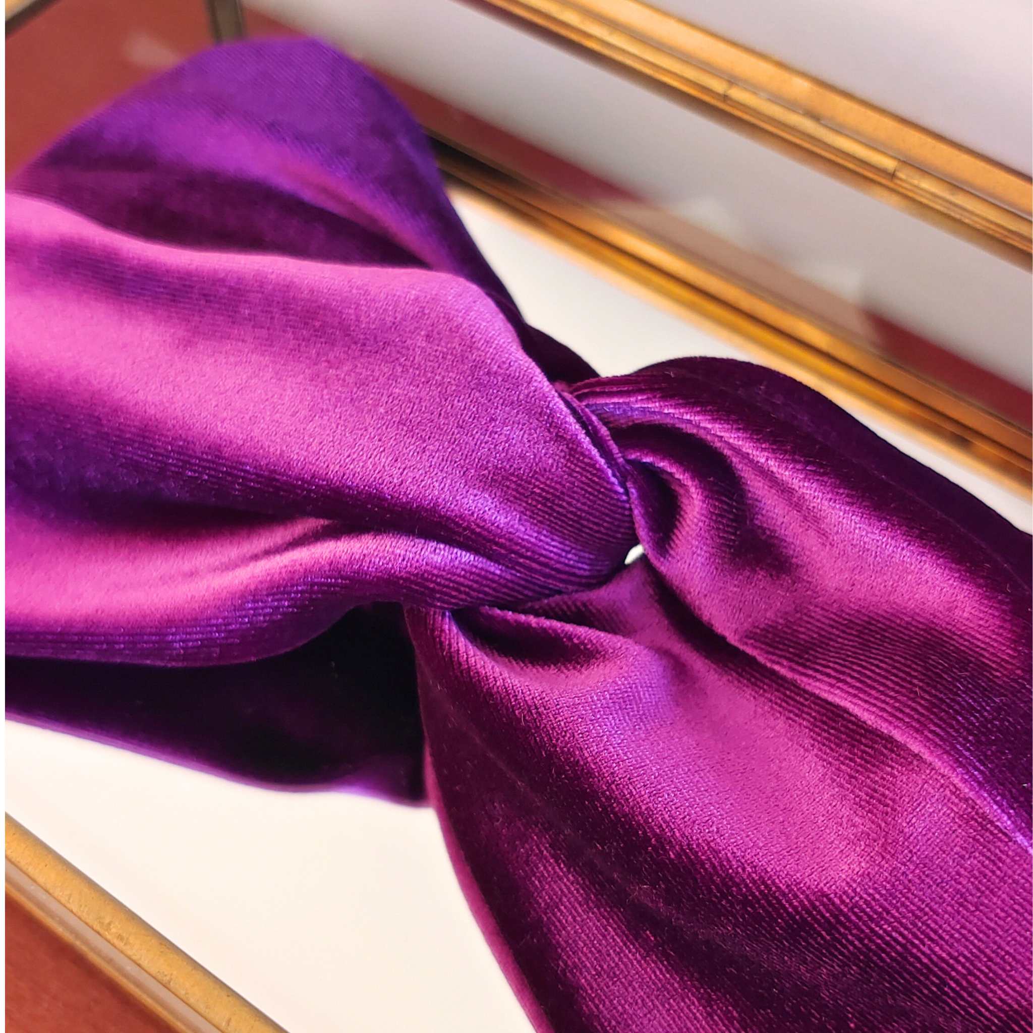 Découvrez ce headband en velours violet et son magnifique drapé aux accents disco.