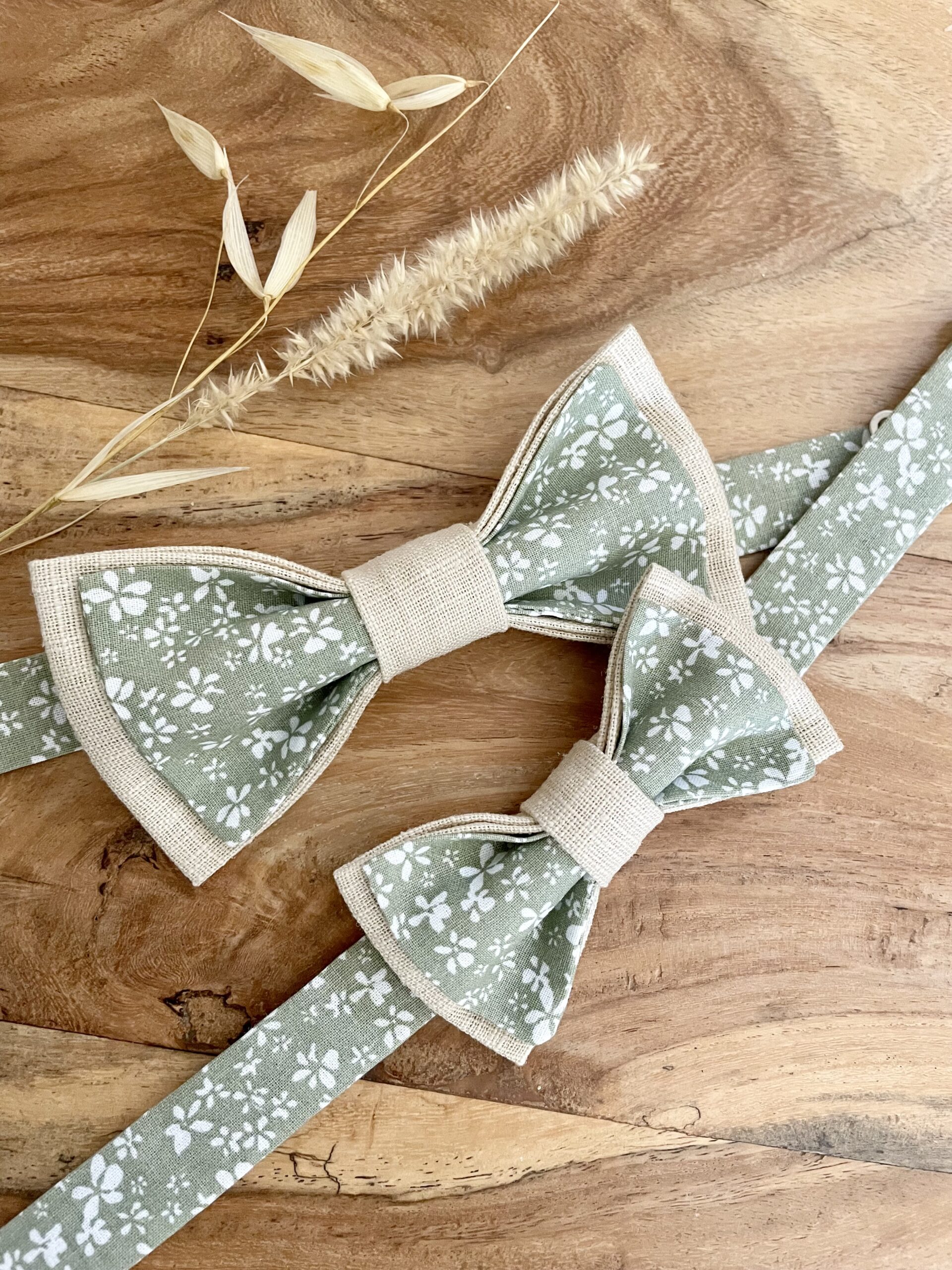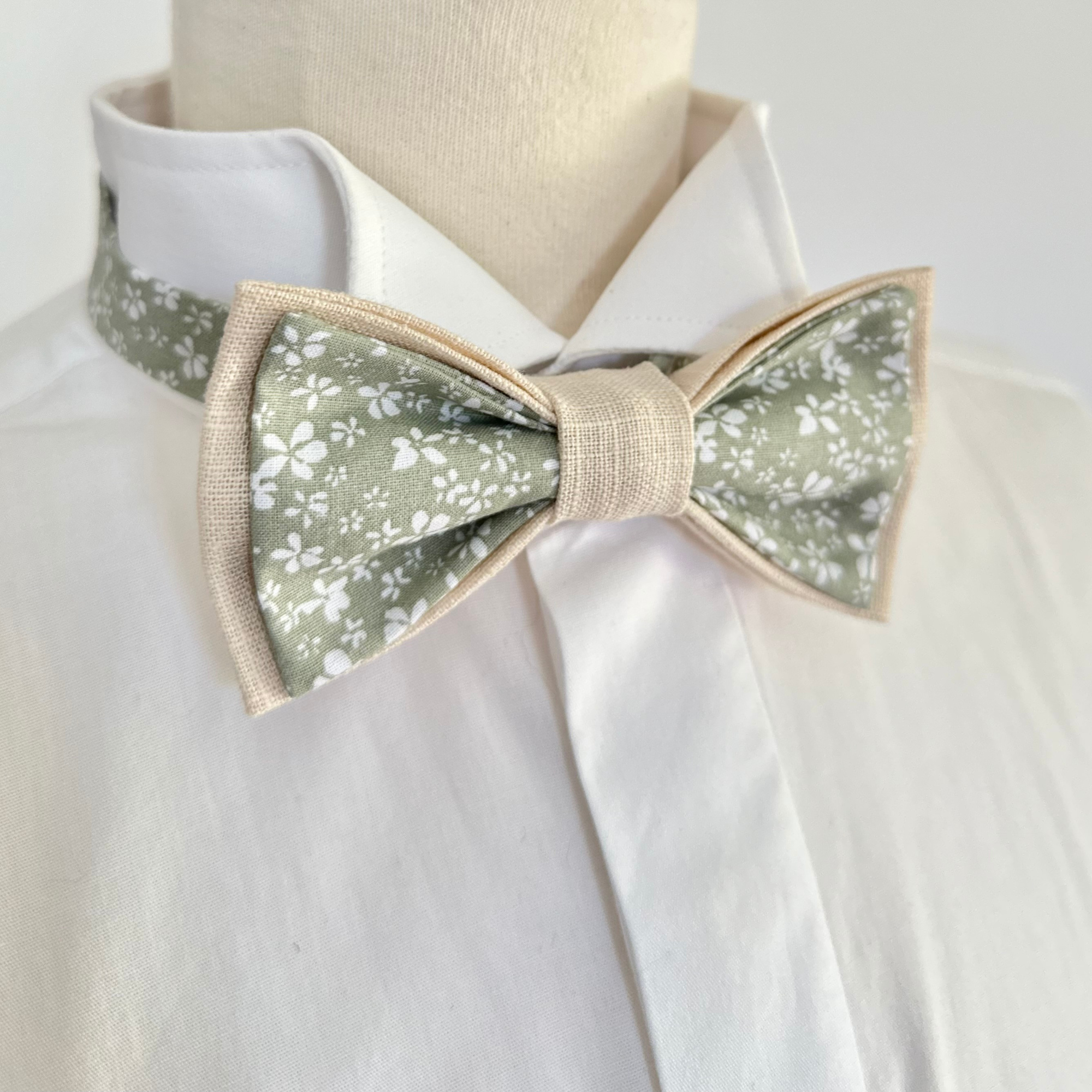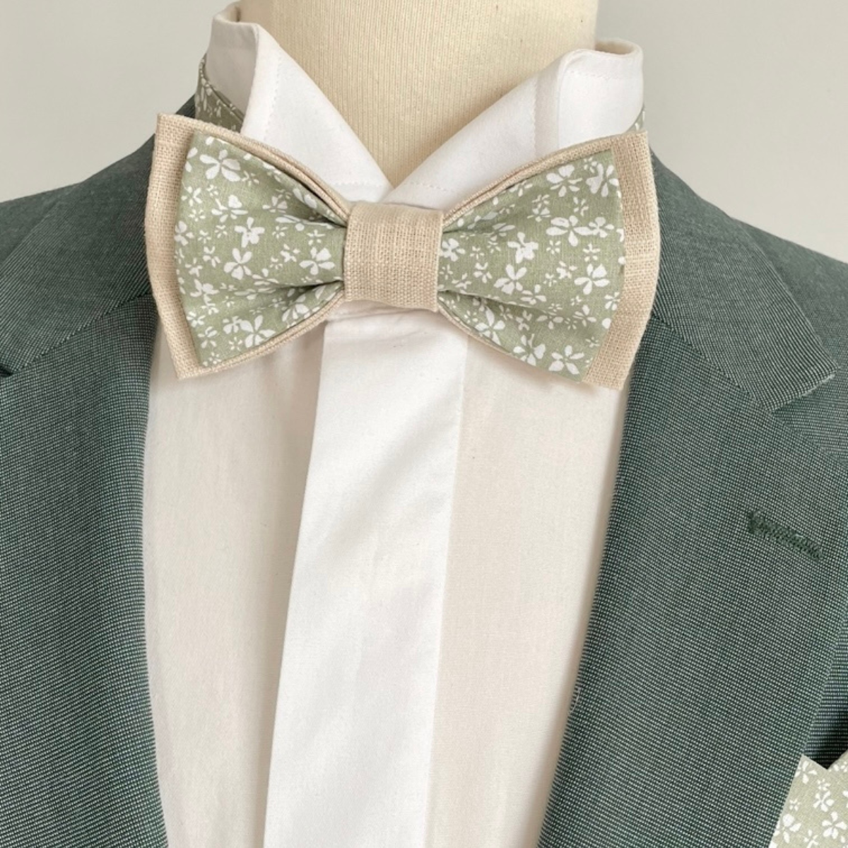 Ce nœud papillon fleuri ultra tendance est l’accessoire parfait pour un mariage à thème vert, vert sauge, un baptême, une communion, un anniversaire ou toute autre occasion élégante et champêtre.